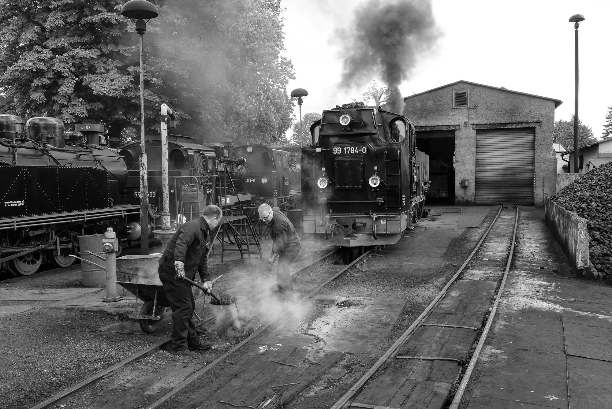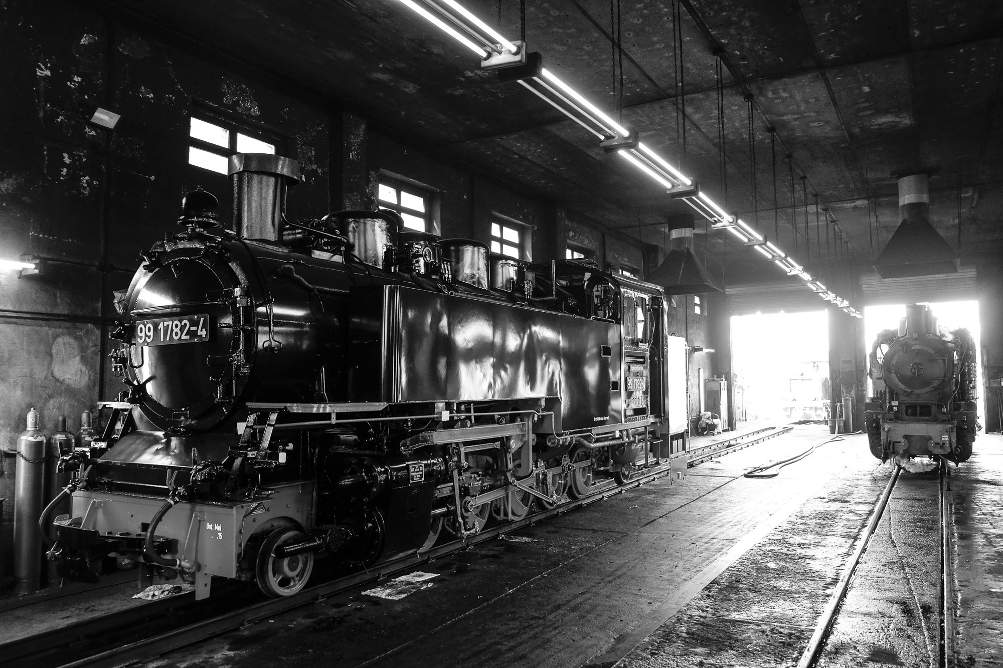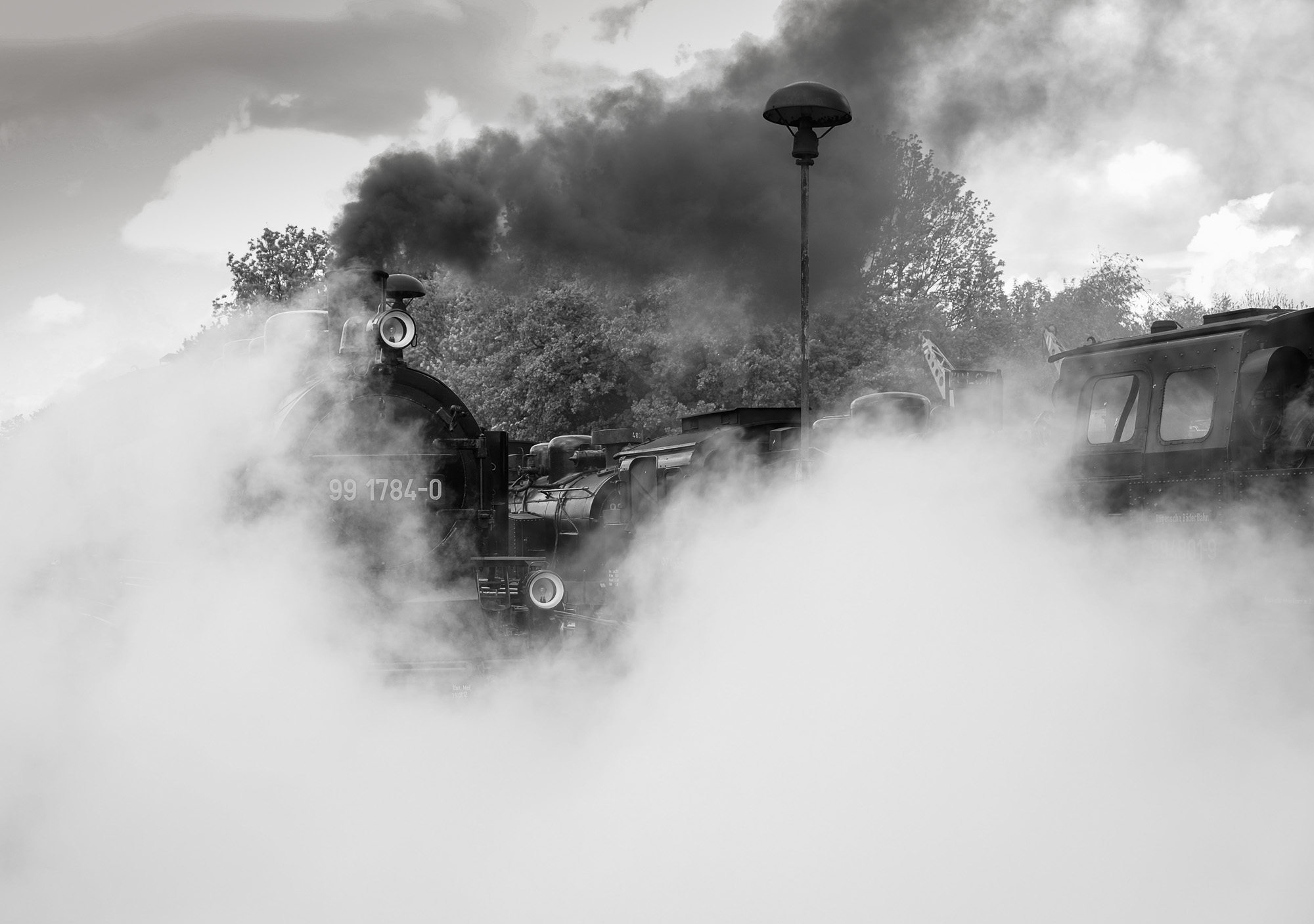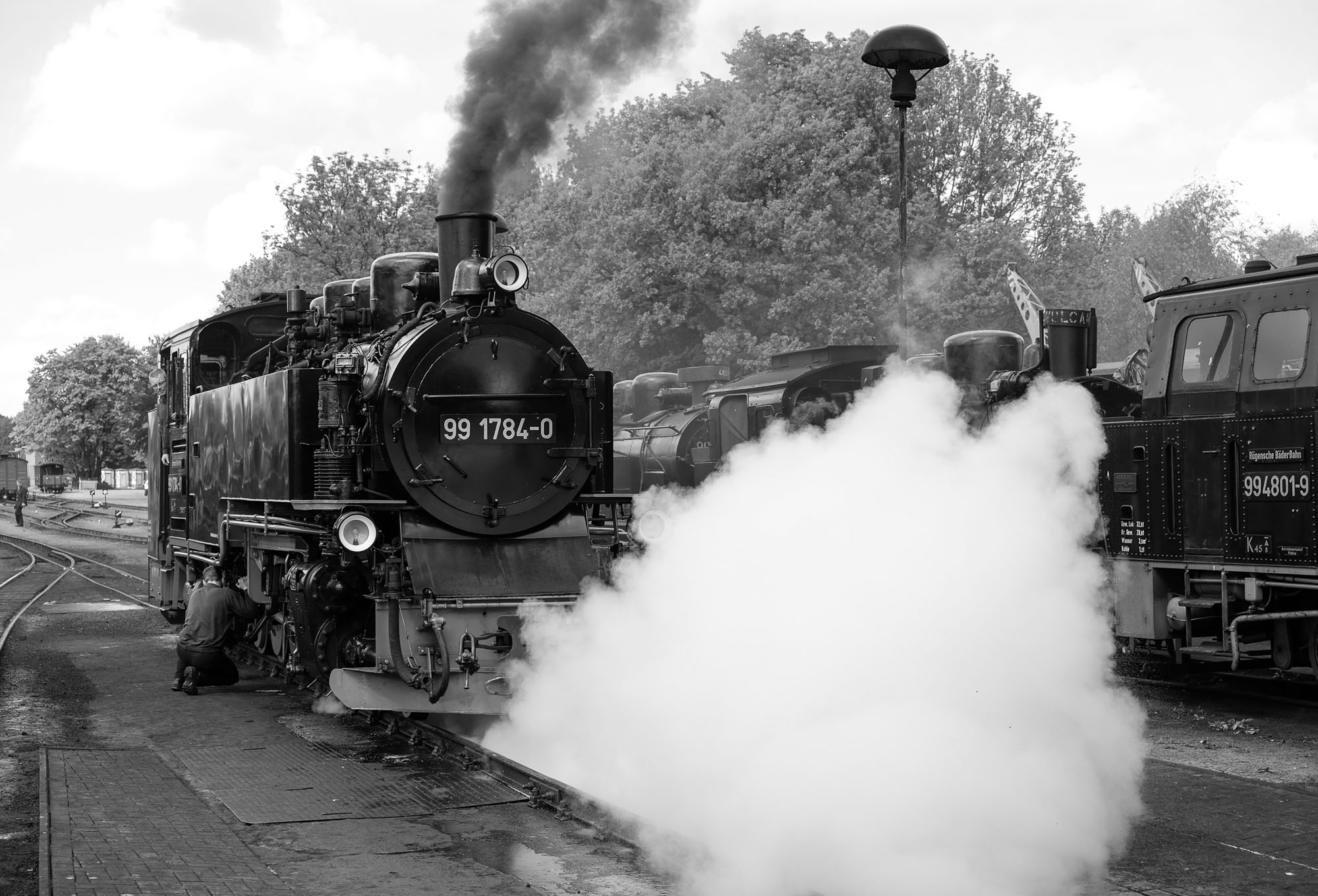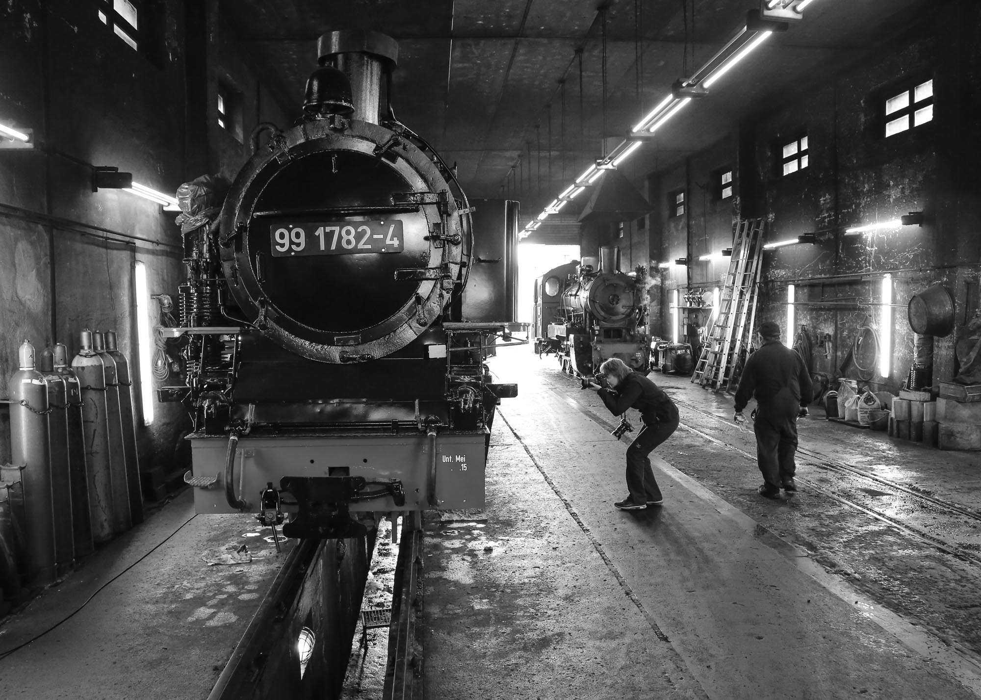 Der Rasende Roland in der Putbuser Werkstatt, Angkor Dwasieden, Friedhof Vilmnitz und auf der Seebrücke von Binz in Schwarz/Weiß