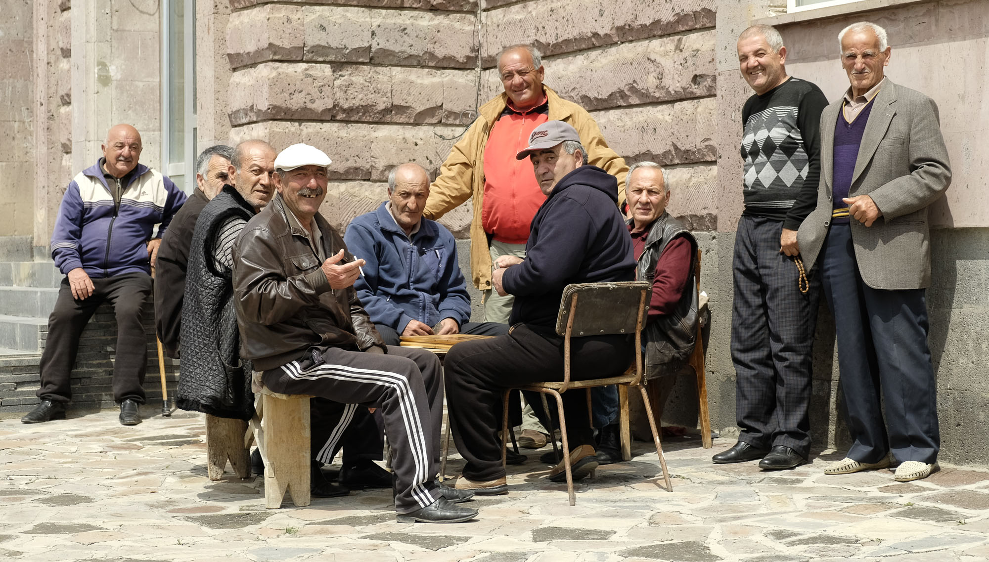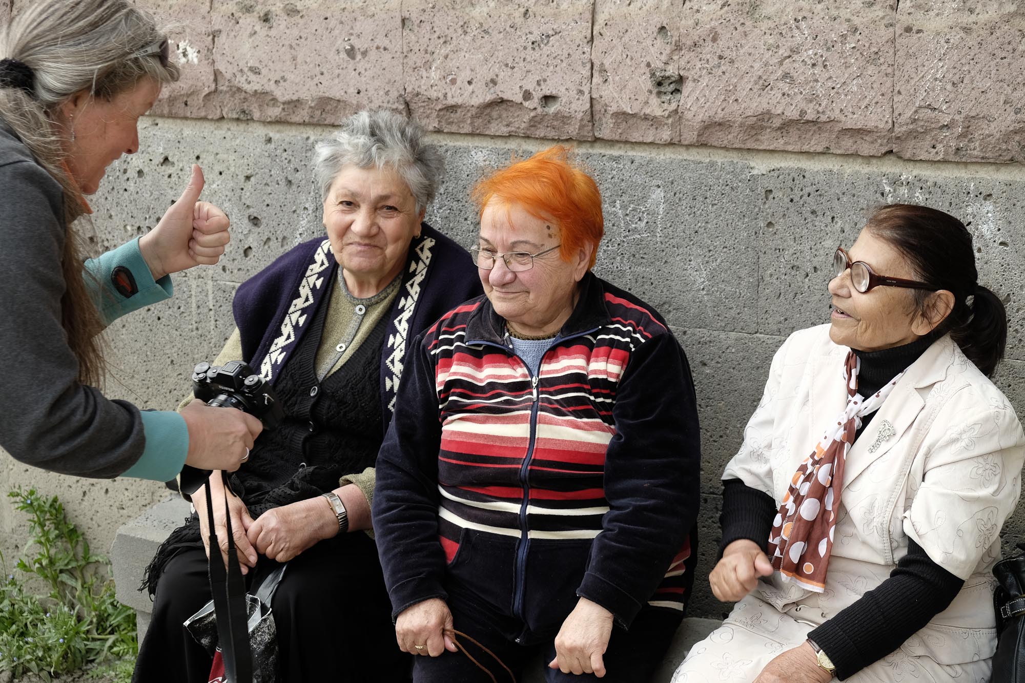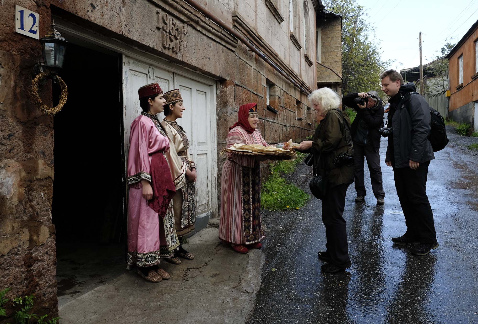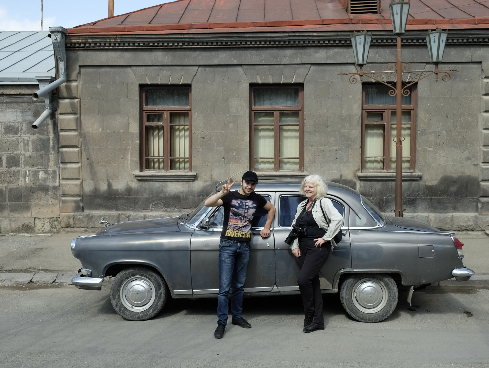 Und gleich nach einer Folkloredarbietung für uns und für eine TV-Aufzeichnung für das Himmelfahrtsfest in Byurakan ging es nach lecker Essen (Stichwort Aprikosensuppe) weiter mit Bergwiesen voller Kräuter, den Geruch haben wir immer noch in der Nase, und riesigen Vorkommen der Iris elegantissima. Fotos mit Ararat im Hintergrund! Bei Einbruch der Dunkelheit waren wir dann glücklich in Gymuri, um hier gegen 21 Uhr zum Abendessen Sterlet und Forellen mit entsprechenden Beilagen serviert zu bekommen. Ein optisch, spiritueller und kulinarischer- gefühlter - 48 Stundentag fand dann gegen 23h sein Ende. Und heute ging es so weiter! Nach Durchstromern eines Teils, der trotz des großen Erdbebens von 1988, erhaltenen Altstadt Gyumris, besuchten wir den bekannten armenischen Bildhauer Albert Vardanyan in seiner Werkstatt. Nach über zwei Stunden konnten wir uns endlich losreißen, nicht ohne seine Familie kennengelernt zu haben und festzustellen, dass die armenische Reiseleiterin Maro, die wir auf unserer Kamtschatkatour 2015 am Bärensee kennengelernt hatten, eine Verwandte von ihm ist. Wie klein doch die Welt ist! Den Rest des Tages verbrachten wir in den immer noch bestehenden Erdbebennotunterkünften von 1988 bei den dortigen Bewohnern, die uns unbedingt ihre Wohn- und Lebensverhältnisse zeigen wollten und der obligatorischen Klosteranlage Marmashen, idyllischen in einem kleinen Tal gelegen und zum Abendessen trafen wir uns wieder mit Albert im exzellenten Fischrestaurant von gestern. Mal schauen was uns der morgige Tag, dann ist auch Jens dabei bringen wird, aber Hrach ist immer für eine Überraschung gut!